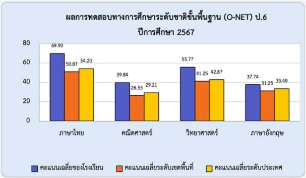 ผลการทดสอบทางการศึกษาระดับชาติขั้นพื้นฐาน (O-NET) ปีการศึกษา 2567 ระดับประถมศึกษาปีที่ 6 ของโรงเรียนบ้านป่าเหมือด (เสริมเกียรติวณิชราษฎร์บำรุง) โดยภาพรวม ทั้ง 4 วิชามีค่าคะแนนเฉลี่ย ดังนี้ วิชาภาษาไทย คะแนนเฉลี่ย 69.90 วิชาภาษาอังกฤษ คะแนนเฉลี่ย 37.74 วิชาคณิตศาสตร์ คะแนนเฉลี่ย 39.84 วิชาวิทยาศาสตร์ คะแนนเฉลี่ย 55.77 ผลการวิเคราะห์ พบว่า ผลการทดสอบทางการศึกษาระดับชาติขั้นพื้นฐาน (O-NET) ของโรงเรียนบ้านป่าเหมือด (เสริมเกียรติวณิชราษฎร์บำรุง) สูงกว่า ระดับประเทศ ทุกรายวิชา |